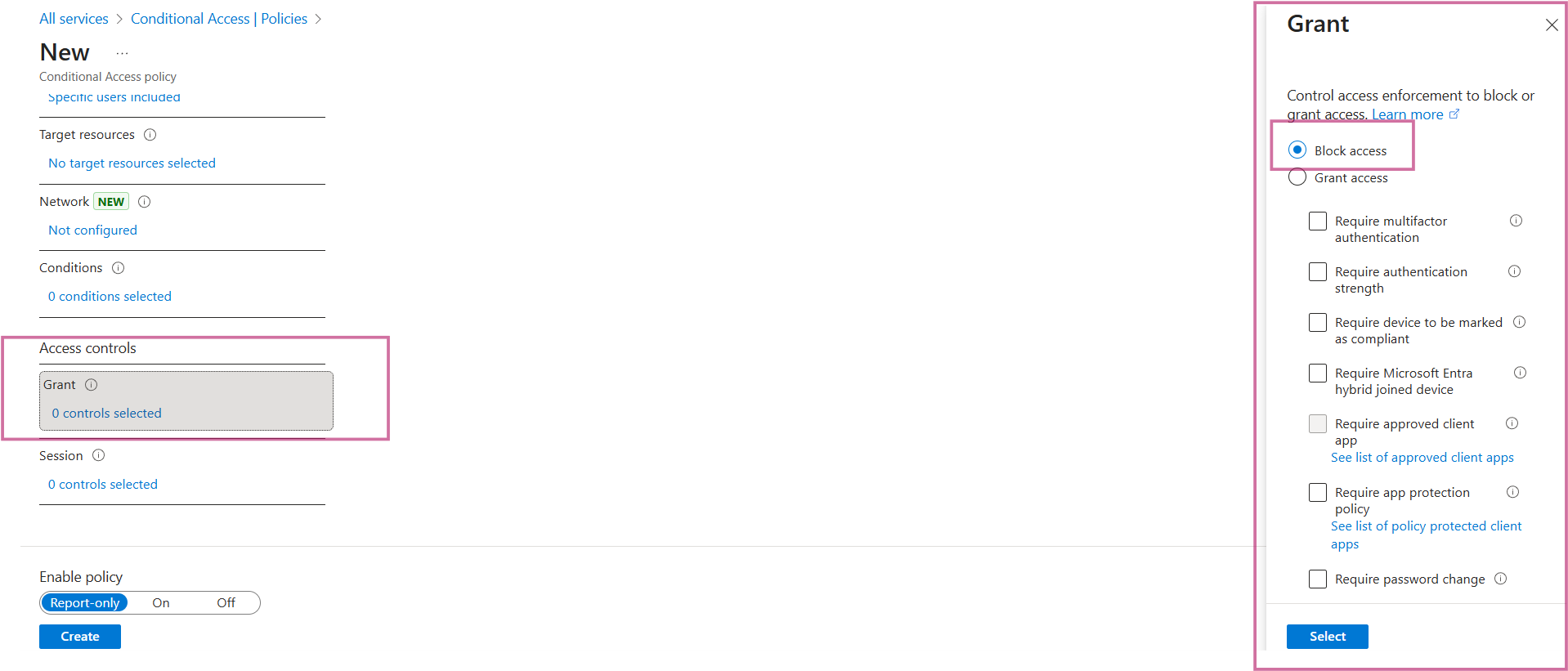 - Click Access controls - control access to either block or grant access based on the controls. In this example access is blocked (Image 3)